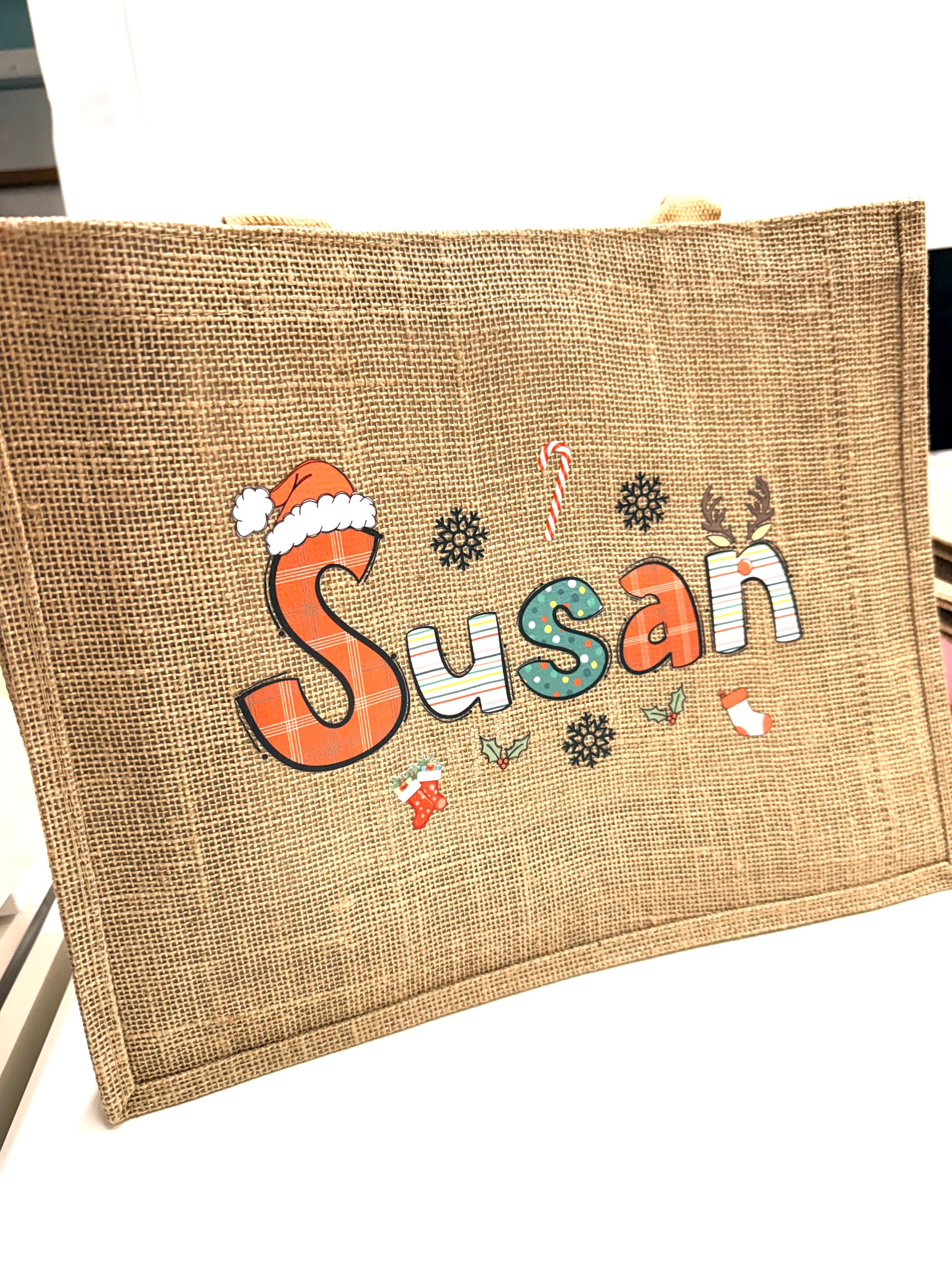 Personalized Name Burlap Tote Bag, Large Capacity Jute Bag, Shopping Bag, Holiday Party Favor, Christmas Gift for Mom/Family/Kid/ Santa Hat